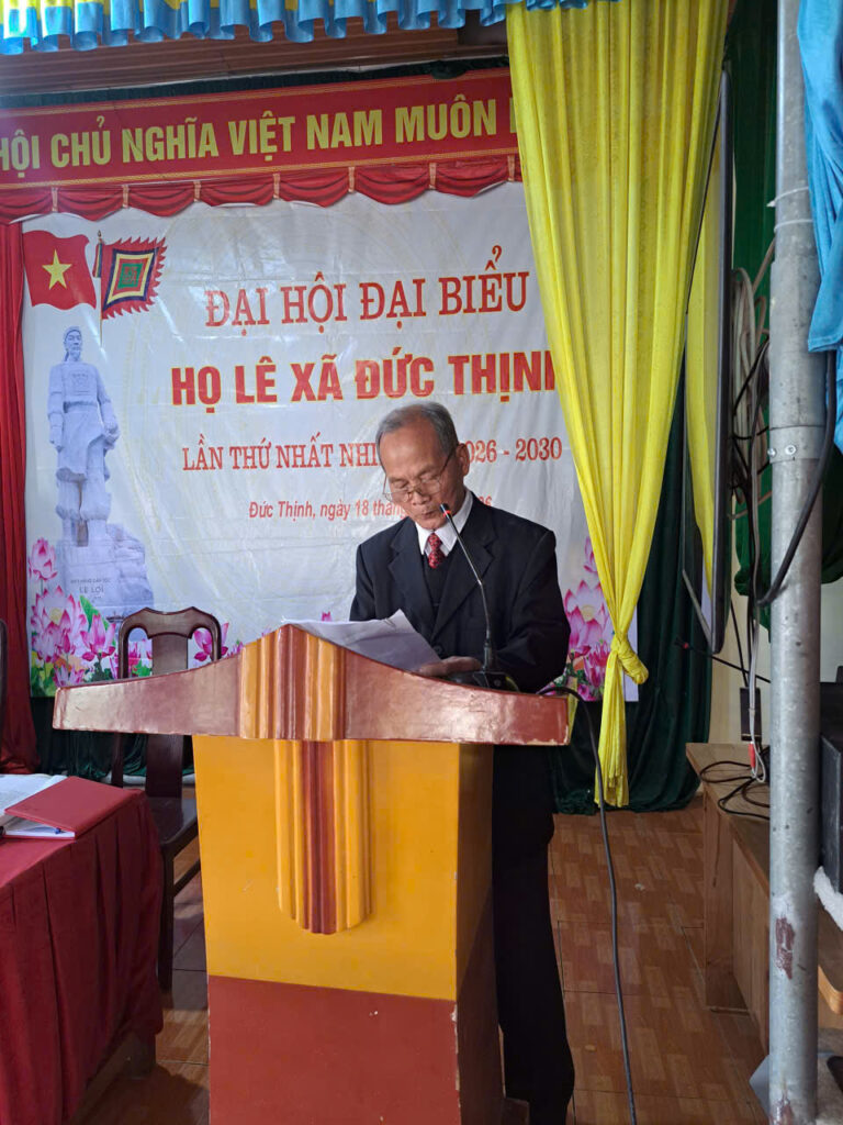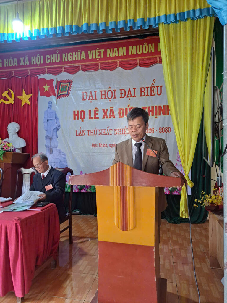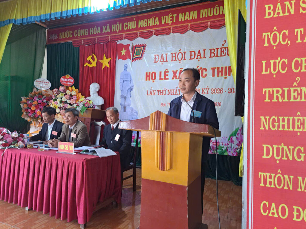 HLVN – Sáng ngày 18/01/2026 tại xã Đức Thuỷ, tinh Hà Tĩnh- quê hương của câc bậc hiền tài; quê hương của GS Lê Văn Thiêm, Họ Lê xã Đức Thủy đã tổ chức Đại hội đại biểu Họ Lê lần thứ nhất nhiệm kỳ 2026-2030. Đây là đơn vi thứ 5 tổ chức đại hội sau khi sáp nhập, thực hiện chính quyền hai cấp. Dự Đại hội có: Ban thường vụ HĐHL tỉnh, toàn bộ Thường trực Đảng uỷ xã Đức Thủy và gần 90 người là trong đó có các con cháu hậu duệ Họ Lê trong xã và mọi miền Tổ quốc.