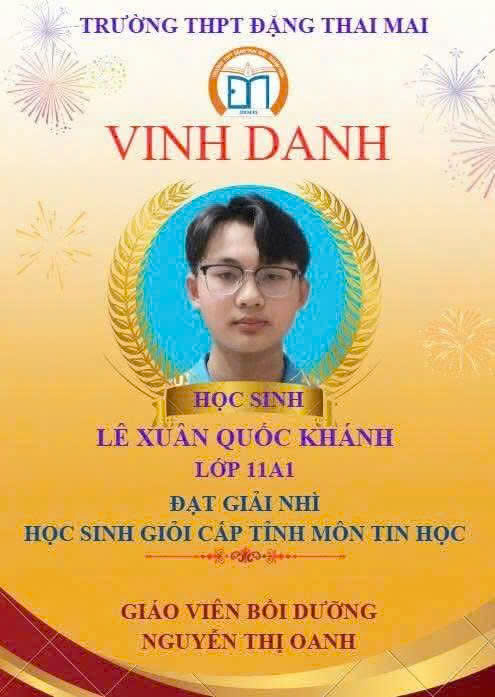 Có được sự động viên cả về vật chất lẫn tinh thần từ gia đình, dòng họ và những người yêu mến, Quốc Khánh càng thêm quyết tâm. Em trân trọng từng giờ học, từng cơ hội được tiếp cận tri thức. Những đêm miệt mài bên máy tính, những lần tự mày mò giải bài, viết code, sửa lỗi… đã trở thành hình ảnh quen thuộc trong ngôi nhà nhỏ nơi làng quê yên bình. Sự nỗ lực ấy cuối cùng đã được đền đáp xứng đáng. Trong kỳ thi học sinh giỏi vừa qua, Lê Xuân Quốc Khánh vinh dự đoạt Giải Nhì môn Tin học cấp tỉnh Thanh Hóa, trở thành một trong những gương mặt tiêu biểu được tuyên dương, vinh danh. Tấm giấy khen không chỉ ghi nhận thành tích học tập xuất sắc, mà còn là phần thưởng cho ý chí, nghị lực và tinh thần không khuất phục trước khó khăn.