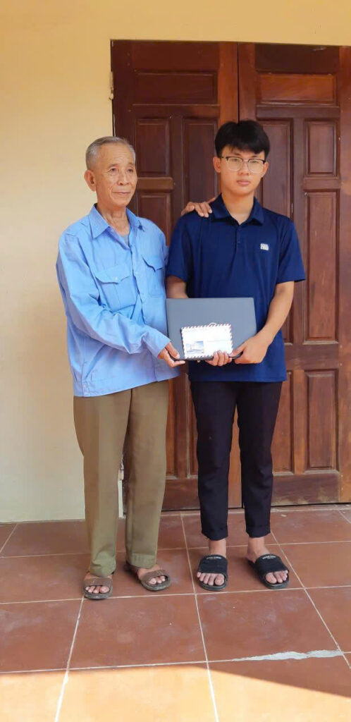 Ông Lê Xuân Phúc (bên trái) trao tặng máy tính và quà động viên em Lê Xuân Quốc Khánh – nguồn động viên quý báu trên con đường học tập của em.