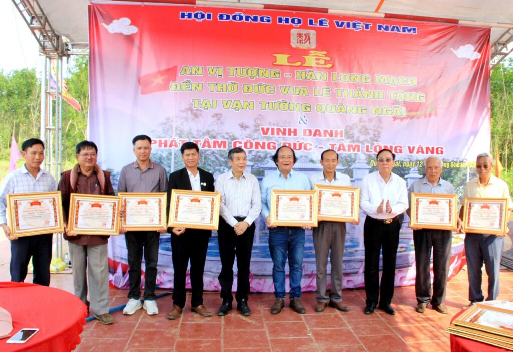 HLVN – Trong 2 ngày 25 – 26 tháng hai Bính Ngọ (12-13/4) vừa qua, tại đền thờ Đức Vua Lê Thánh Tông – Vạn Tường, Quảng Ngãi, HĐHL Việt Nam, HĐHL tỉnh Quảng Ngãi cùng chính quyền địa phương, bà con nhân nhân trong và ngoại họ tộc đã tổ chức lễ An vị tượng Đức Vua Lê Thánh Tông và Hàn Long mạch, Hầu đồng. Dự buổi lễ có lãnh đạo HĐHL Việt Nam, lãnh đạo HĐND, UBND cùng các ban ngành đoàn thể xã và gần 200 người là con cháu Họ Lê và nhân dân về dự lễ, chiêm bái, dâng hương; nhiều vị đã có hành trình từ Hà Nội, đặc biệt là Thanh Hoá- Nơi phát tích của nhà Hậu Lê đã tập trung về đền thờ.
